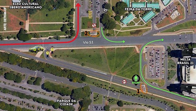 A partir da Torre de TV, o tráfego de veículos na S1 permanecerá liberado. Na altura da Rodoviária de Brasília haverá um bloqueio, e o acesso à alça leste da ERB será permitido apenas para ônibus.