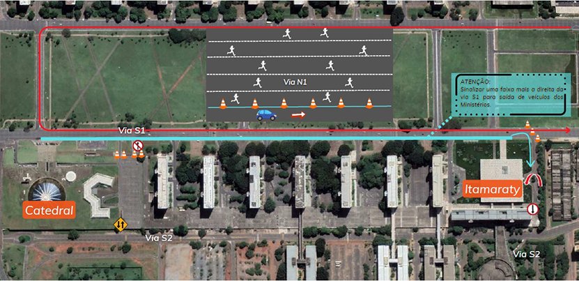 Na via N1, o bloqueio ocorrerá desde o quartel do Corpo de Bombeiros Militar do Distrito Federal (CBMDF) até a altura da via L2 Norte. Os acessos à N1 pela via Palácio Presidencial e pela L4 Norte ficarão fechados. Na N1, a faixa mais à direita, a partir do quartel do CBMDF, será destinada à saída de veículos de emergência, enquanto as demais faixas serão utilizadas pelos participantes do evento. A previsão é que as interdições ocorram até as 10h.